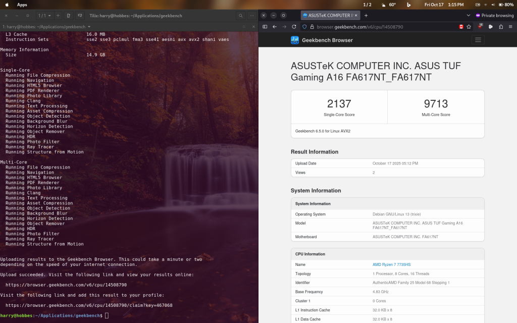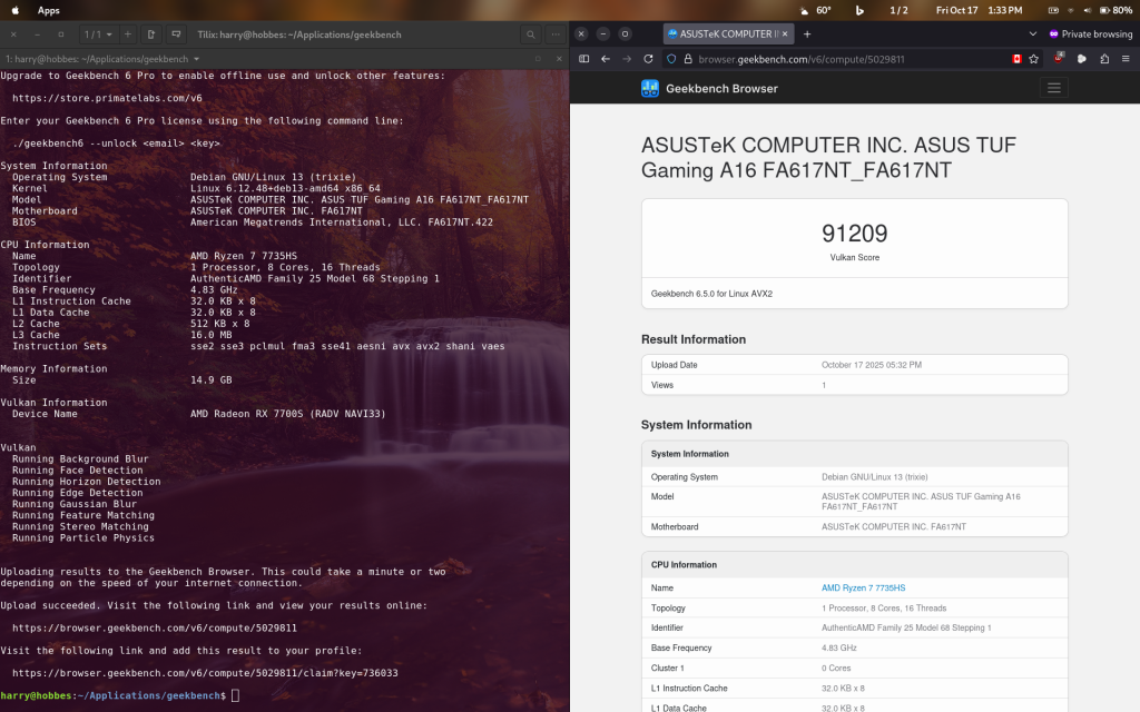 After desktop configured and applications installed, I ran Geekbench 6 to get a sense of Debian 13 performance.