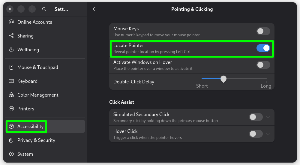 In Gnome Settings, Locate Pointer is enabled in Accessibility > Pointing & Clicking so when I press left Ctrl button on the keyboard, the desktop will display a visual cue on the pointer location.