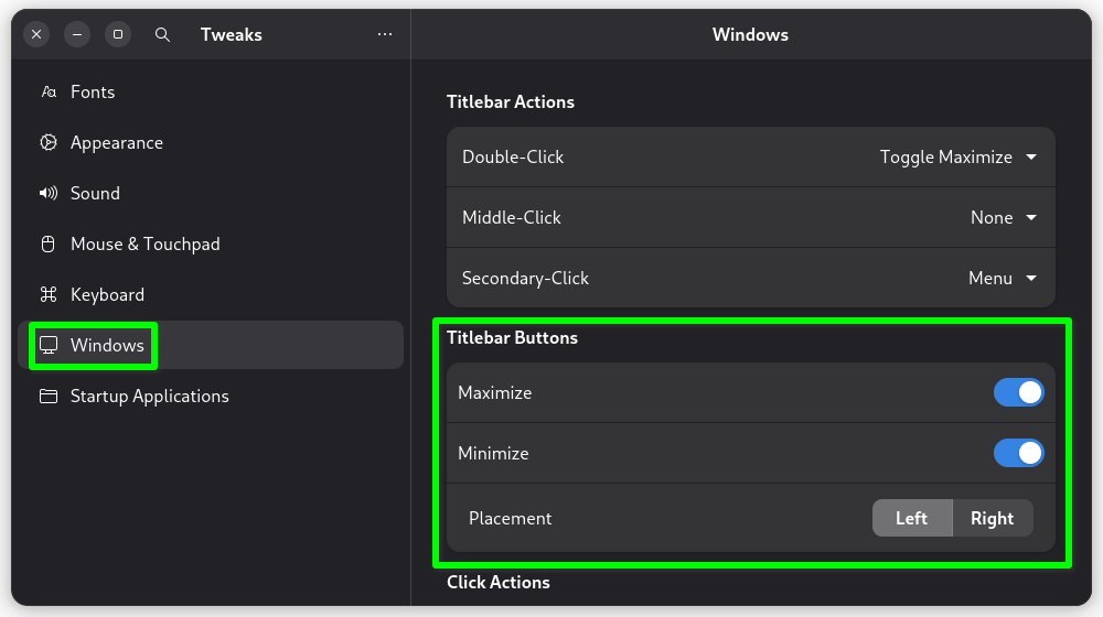 Using Gnome Tweaks, I have enabled Maximize and Minimize buttons on the windows title bar and moved them to the left. Not all applications follow these settings though. Notable exceptions: FileZilla and ksnip.