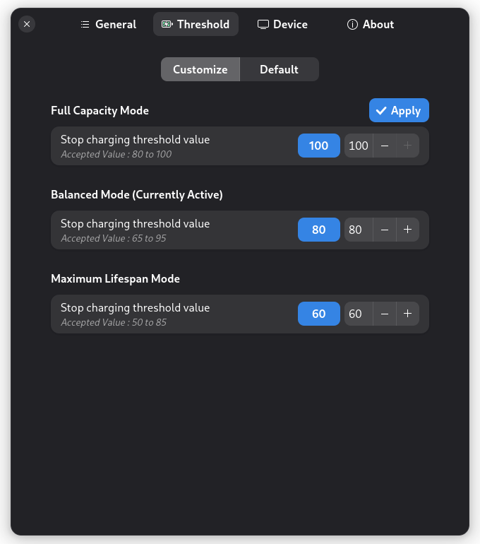 Standard Debian 13 install does not have any battery charging options. Gnome extension Battery Health Charging save the day. It limits battery charging to 80% by default like most devices these days.